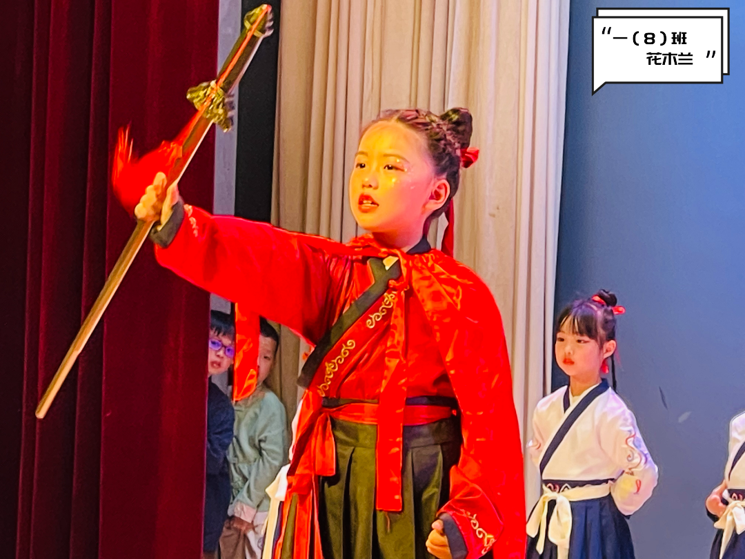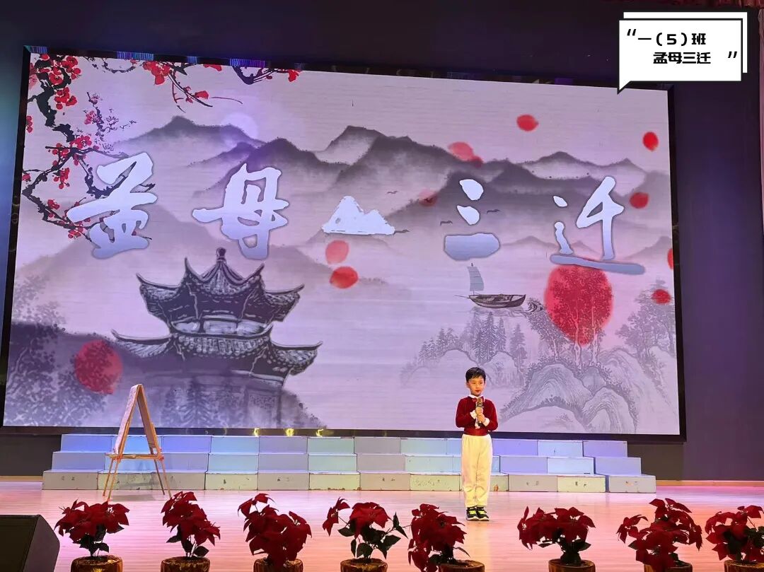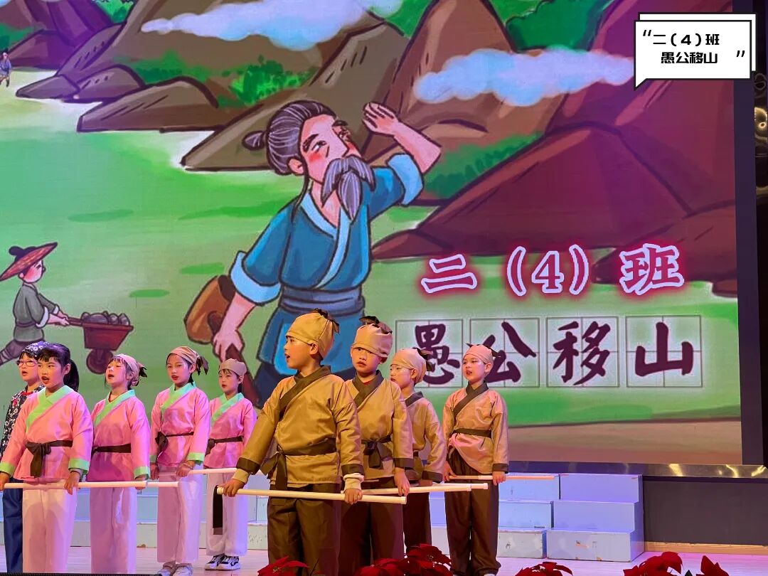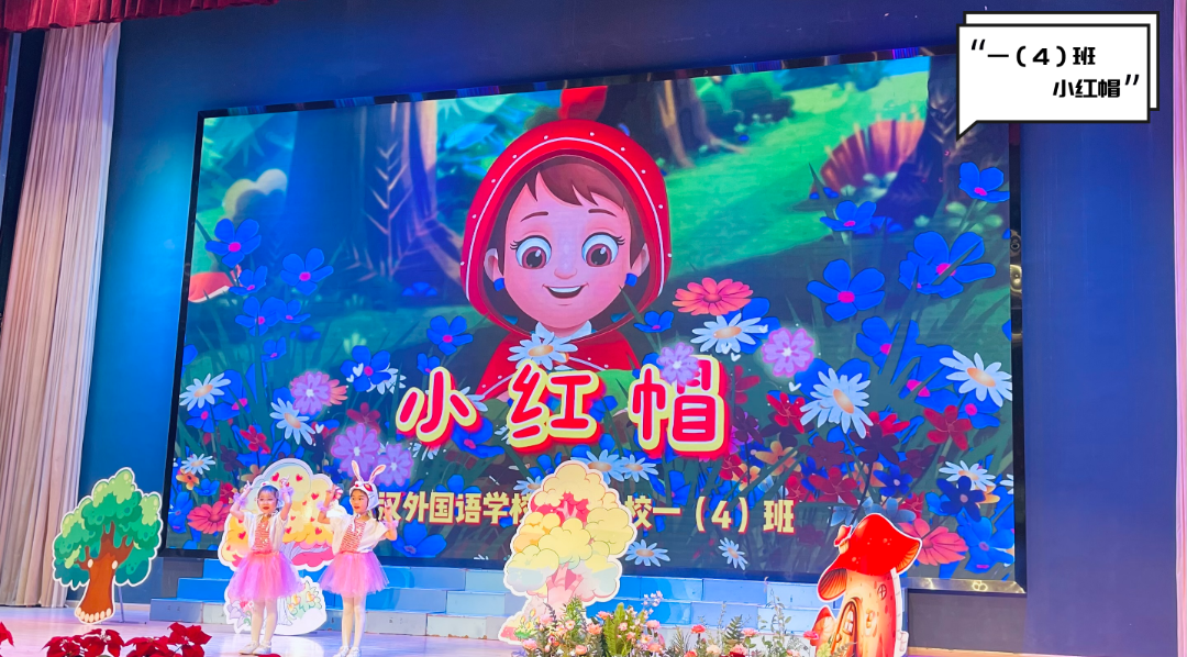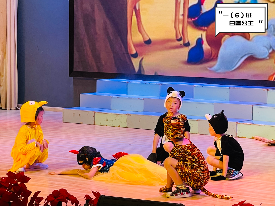 一、二年级的学生们几乎全员上台,演绎读过的经典童话、寓言或故事,如《孔融让梨》、《愚公移山》、《小红帽》……