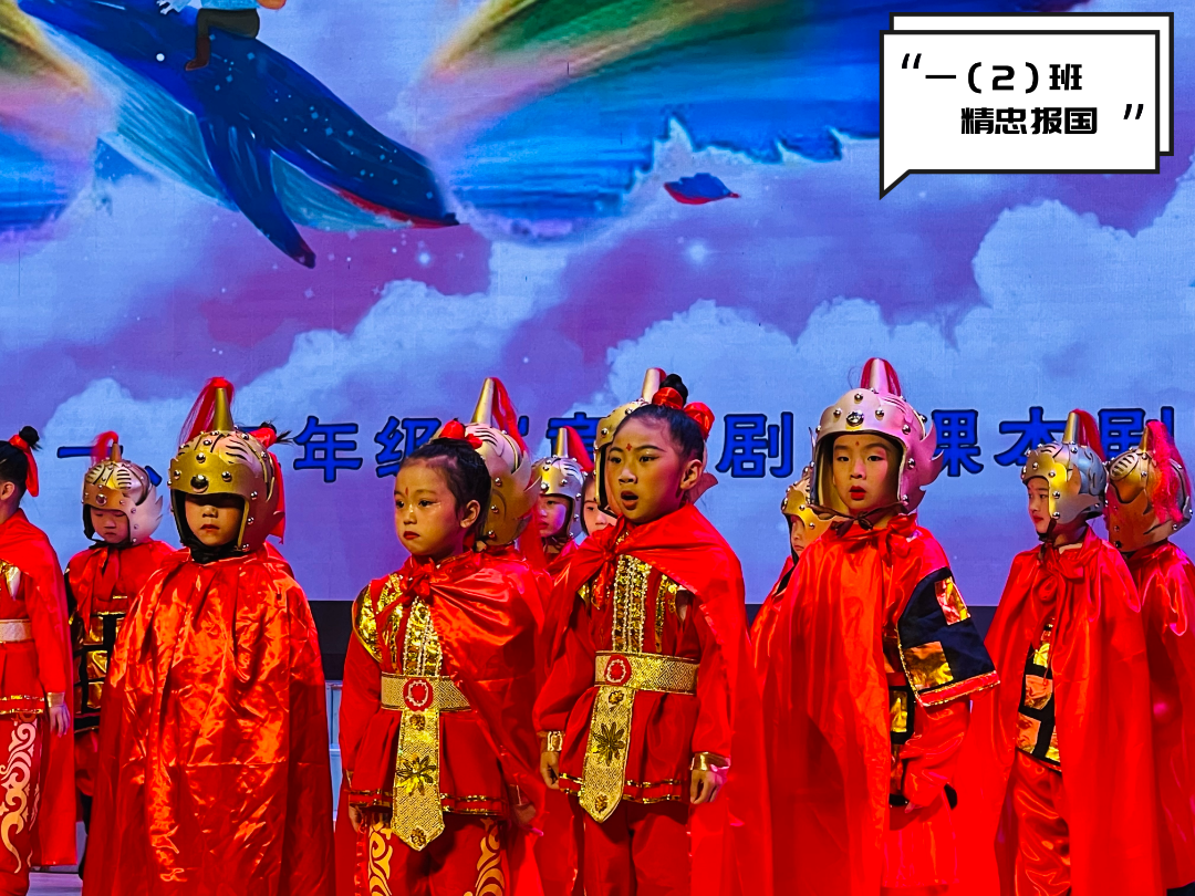 一年级同学们化身一个个唱跳俱佳的小演员,轮番上阵,语言生动有趣、姿态落落大方,动作憨态可掬,刻画细致入微,诠释了一个又一个鲜明的童话故事。