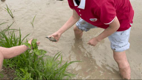 有了和泥土的亲密接触后,“摸鱼”可就难不倒大家了。刚下田时还在意衣服裤子有没有弄脏,现在完全不放在心上,眼睛只顾着搜寻哪里有鱼的踪迹,手也放心大胆的伸进泥土里摸索,让泥鳅无处可逃。就连因为插秧累弯了的腰,此刻也重新恢复了活力,男生女生一起在田里摸鱼,抓泥鳅,玩得不亦乐乎。