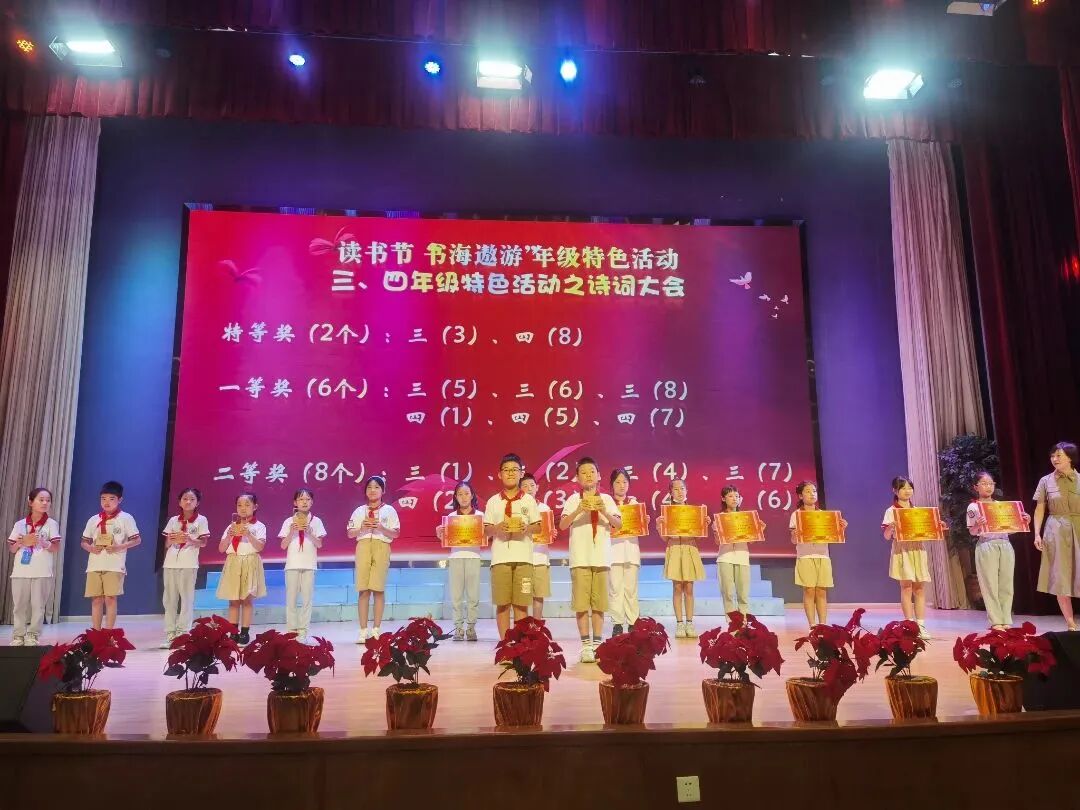 本届读书节活动,全体学生和家庭齐参与,共评出书香班级12个,年级特色活动特等奖班级6个,一等奖18个,二等奖24个。学生奖项中评出“好书推荐官”240名,“书香少年”240名,“最美朗读者”16名。亲子共读,阅见美好,活动评选出“书香家庭”48个,助力营造书香家庭,播撒幸福的种子。